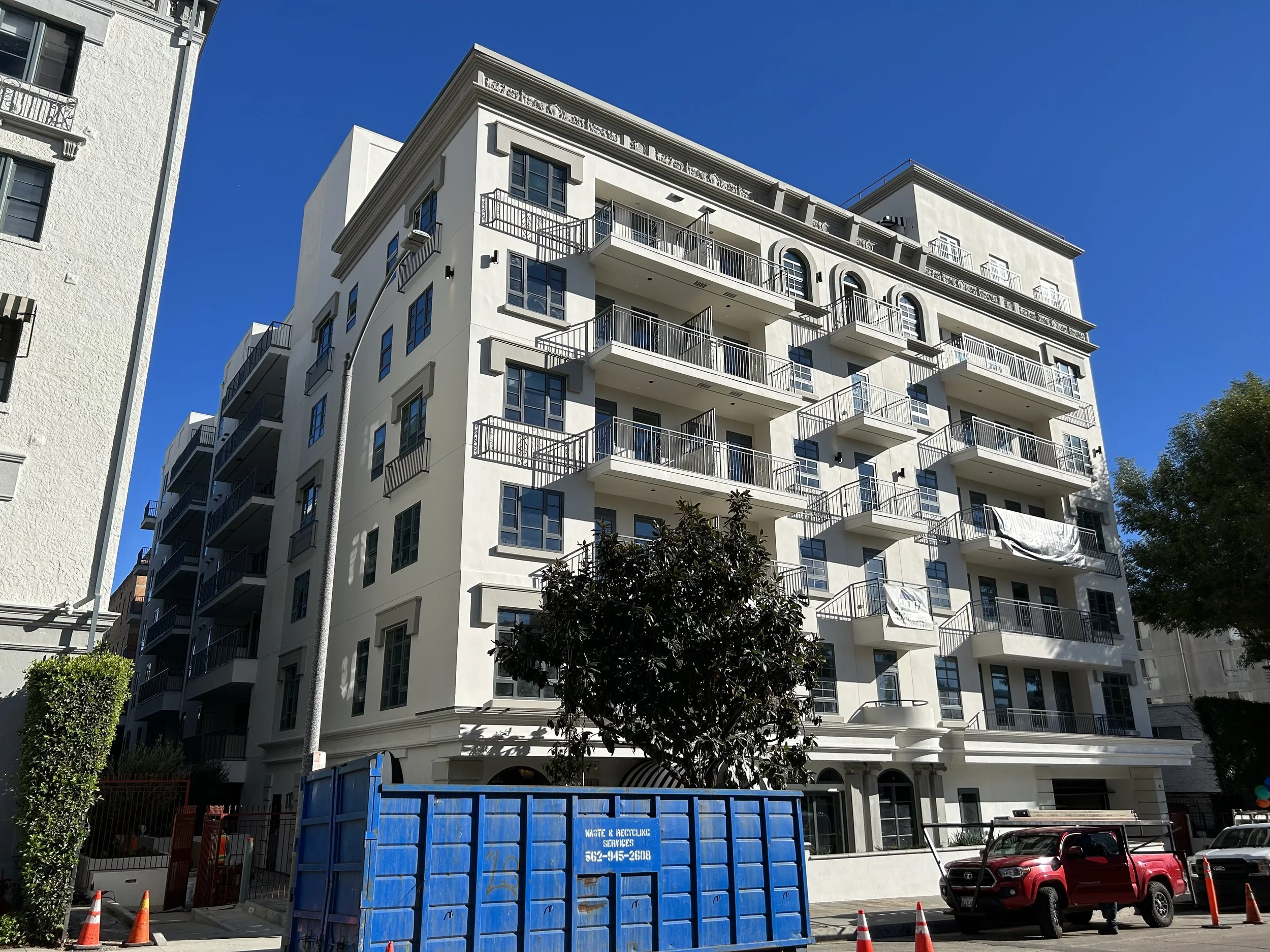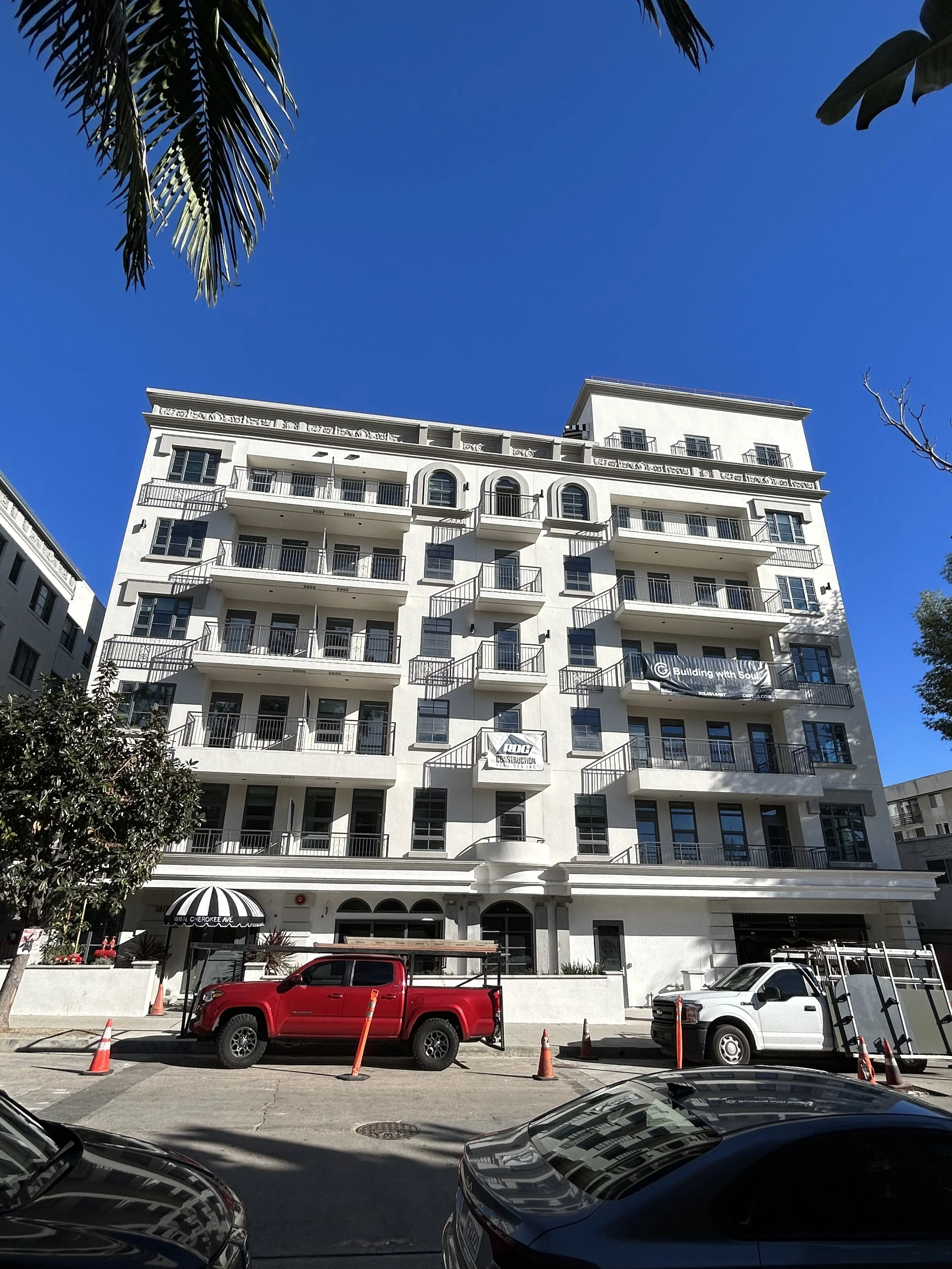 A seven-story apartment building in the heart of Hollywood with a design inspired by the classic neighboring residences.