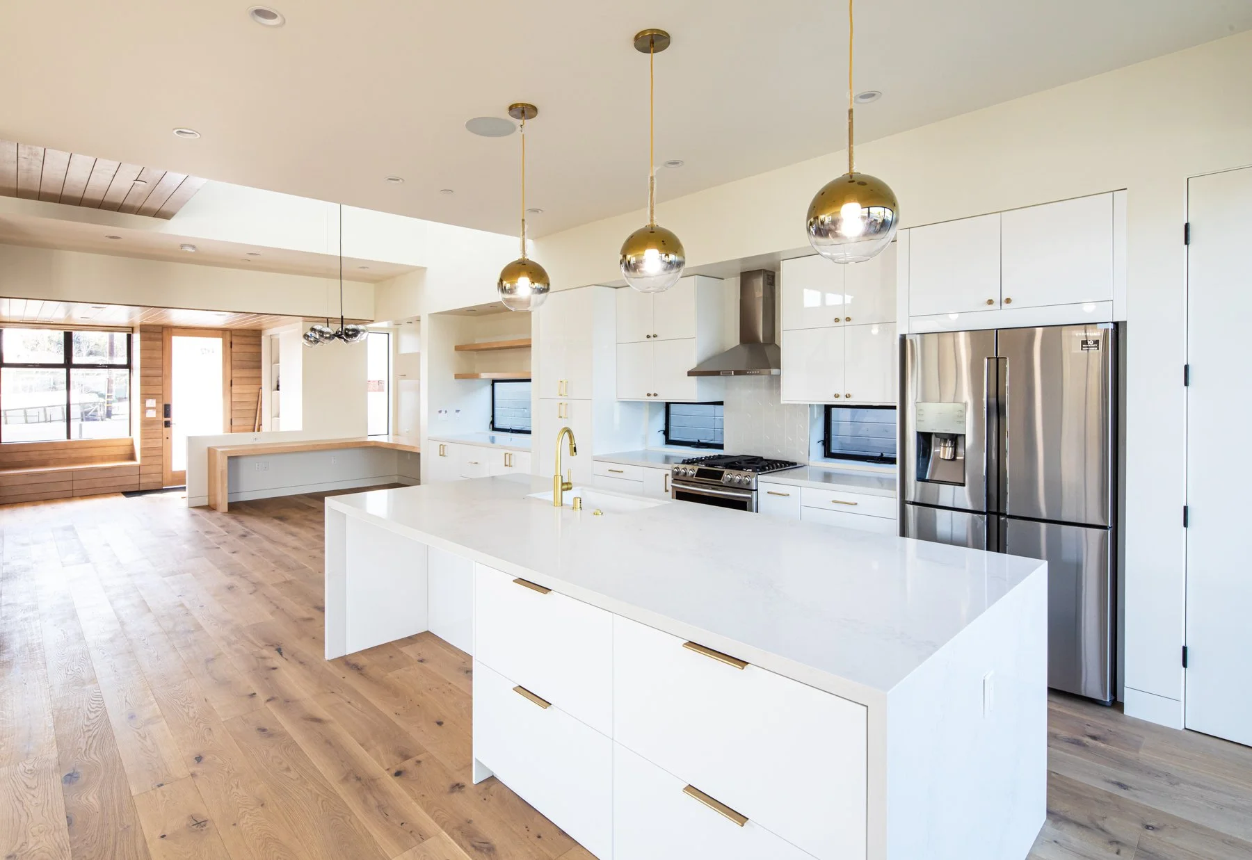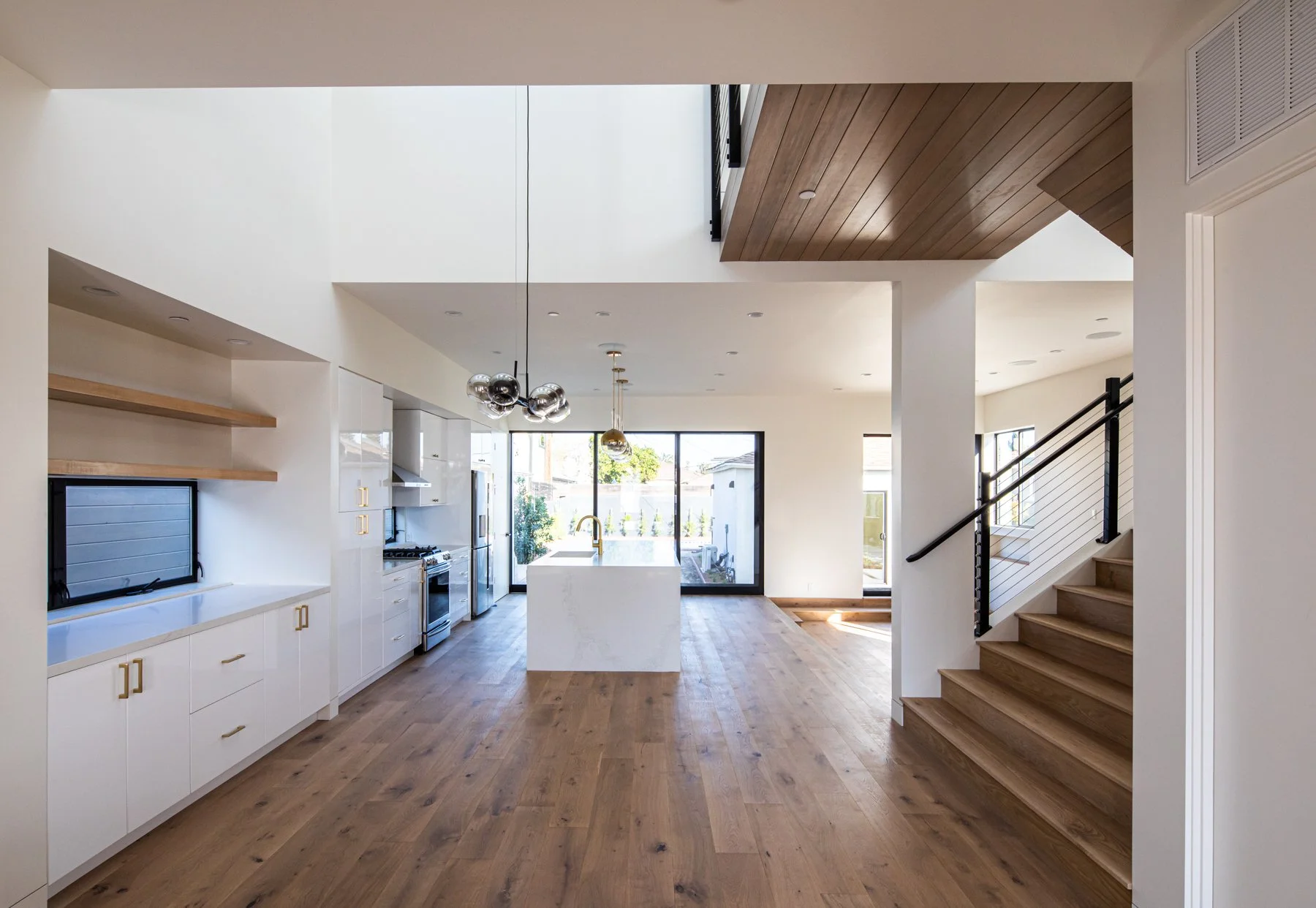 An elegant new 2,300-square-foot residence in the Westside Del Rey neighborhood in Los Angeles. The design was closely coordinated with the architect to ensure an economical, conventional wood-framed structure whilst achieving a modern, open plan, light-filled house.