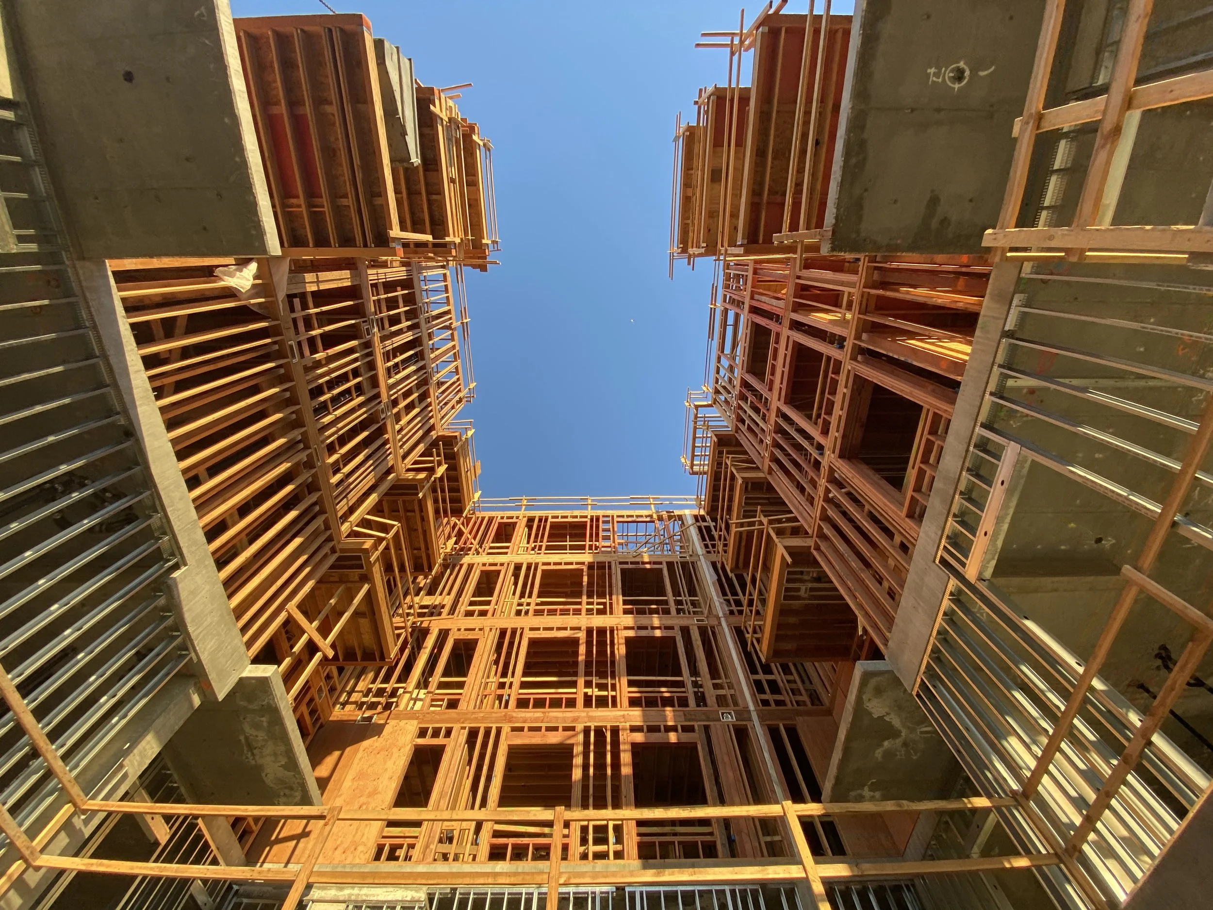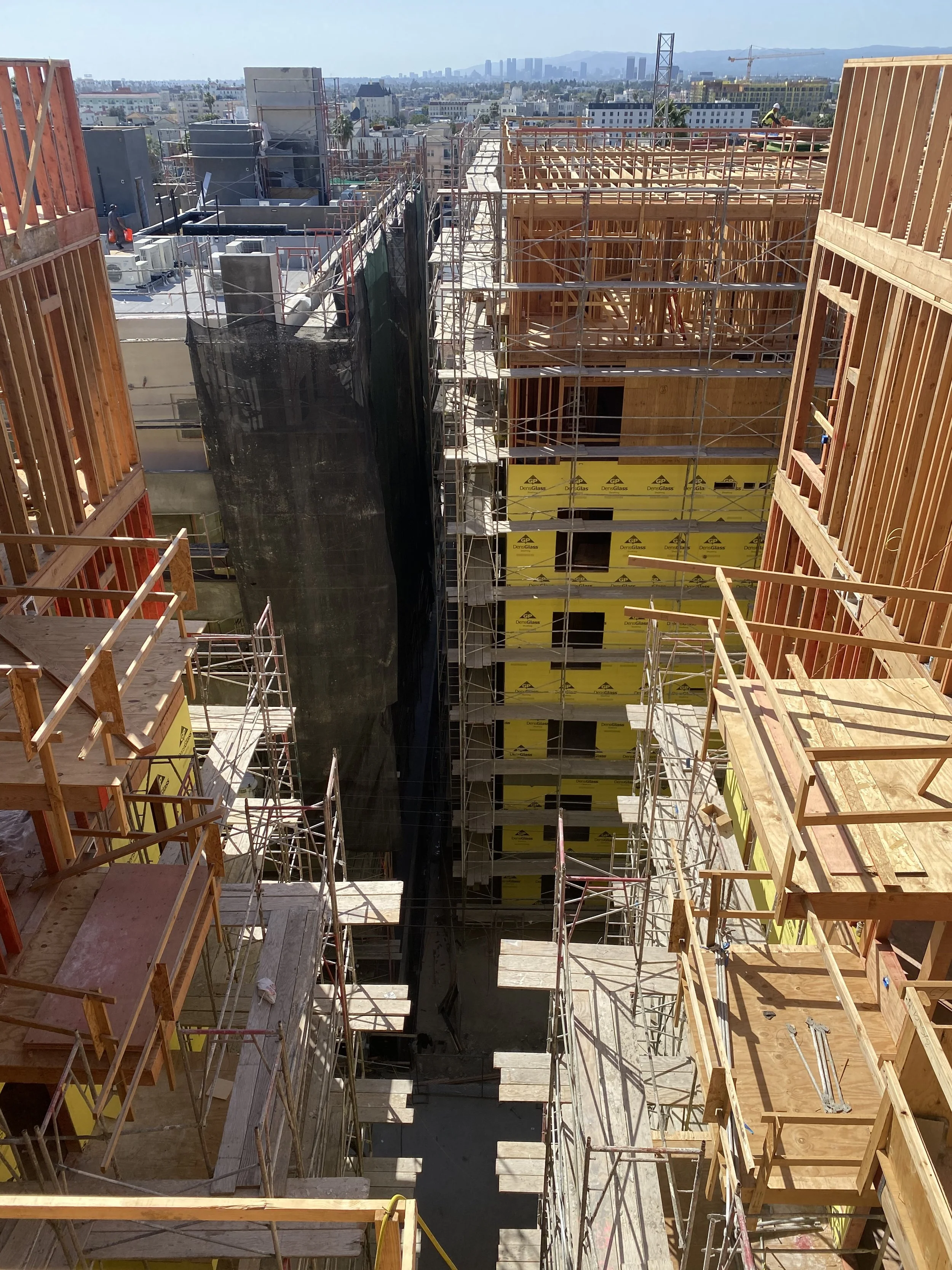 Each building has five stories of Type IIIA construction over two stories of Type IA podium. An additional two levels of basement parking create a total of 272,000 square feet of construction area.