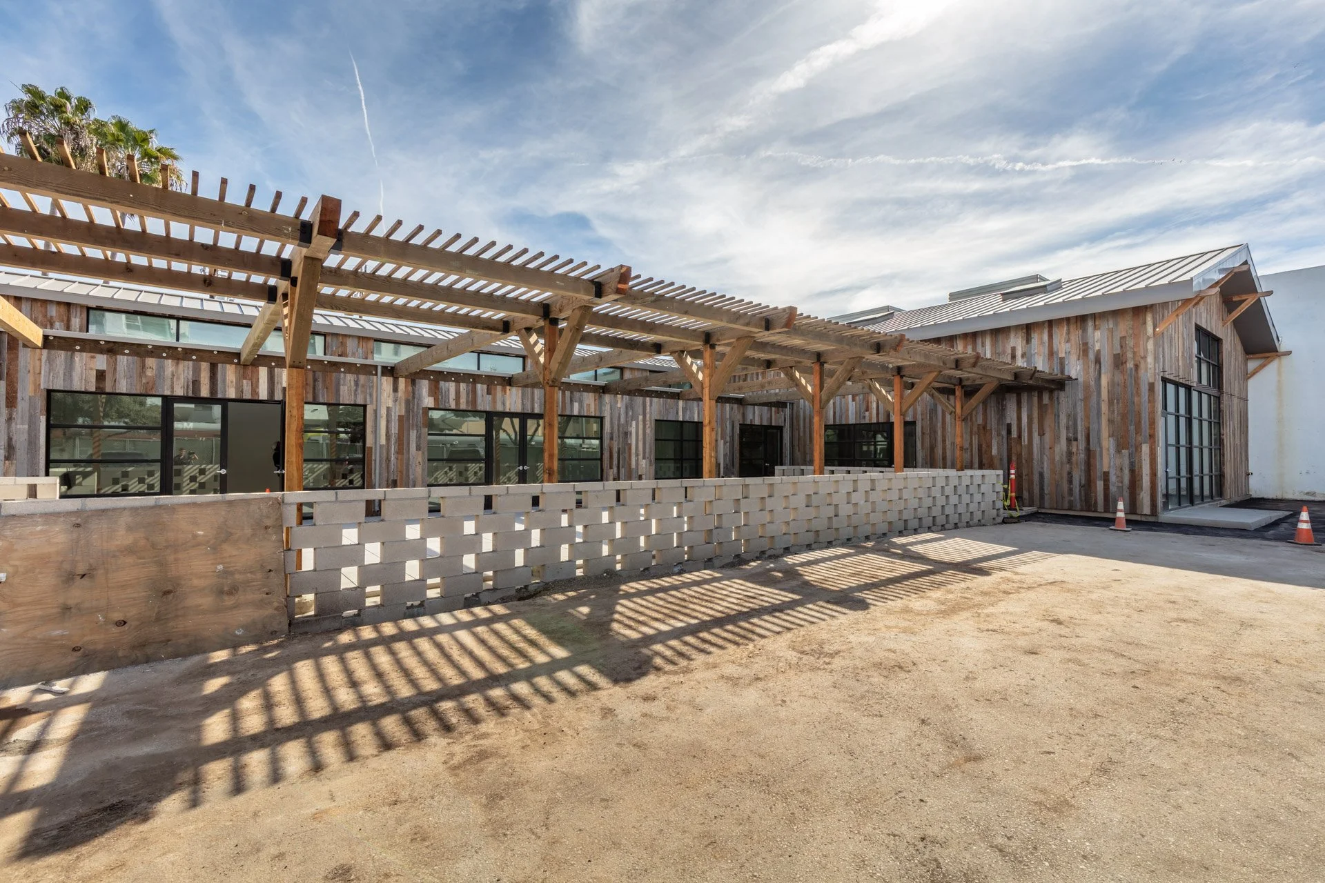 At the east of the site is a remodeled concrete masonry building with long span tapering girders. This structure was updated with a new, centrally located, pop-up clerestory roof and extensive new openings in the perimeter wall facing on to a new terrace. The terrace features a unique masonry screen wall and a wood-framed long-span trellis canopy.