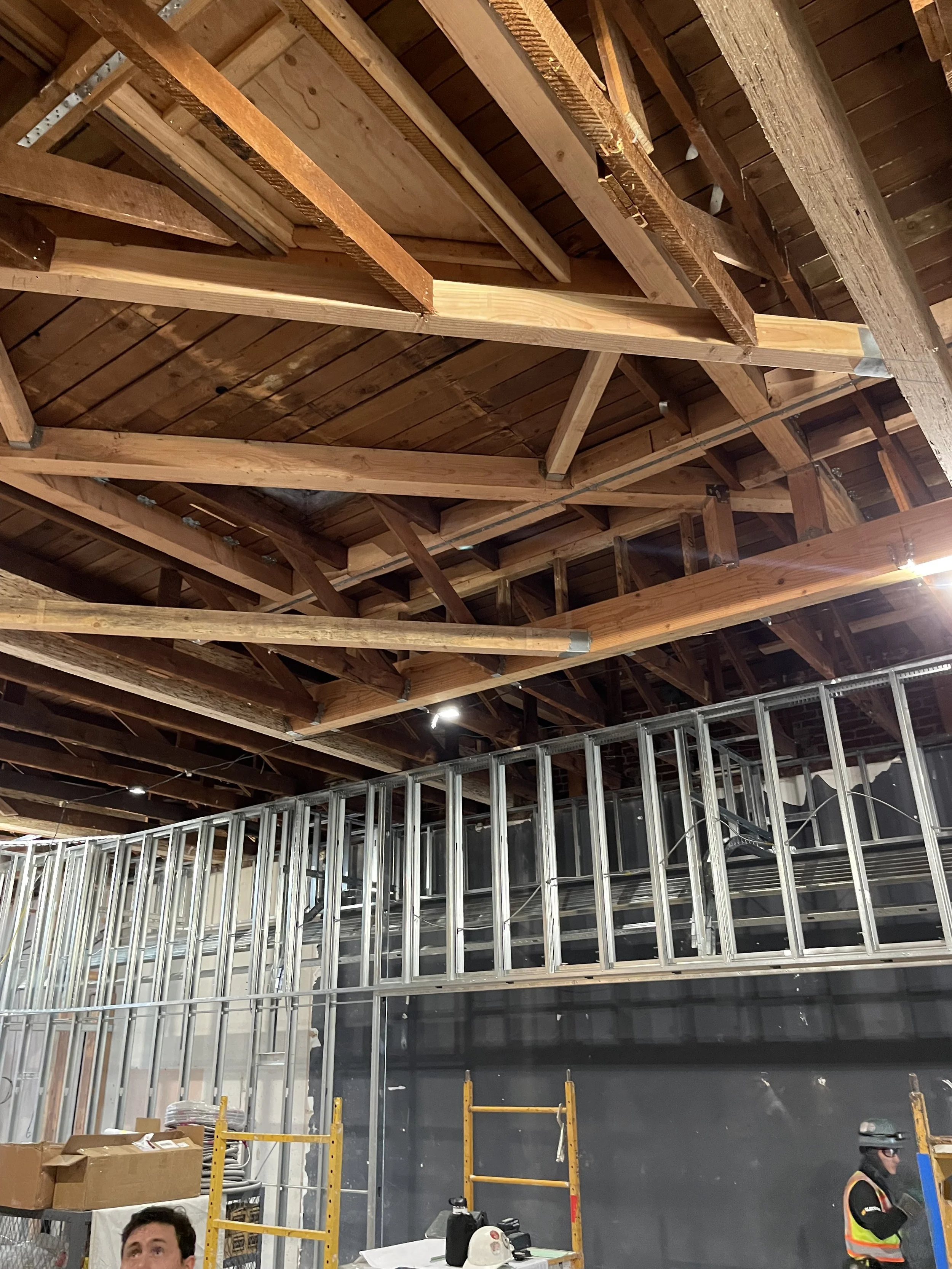 The new design featured a large conical skylight that necessitated a complex arrangement of reinforcing beams and hardware to allow for the existing roof truss framing and to reinforce the diaphragm for the opening.