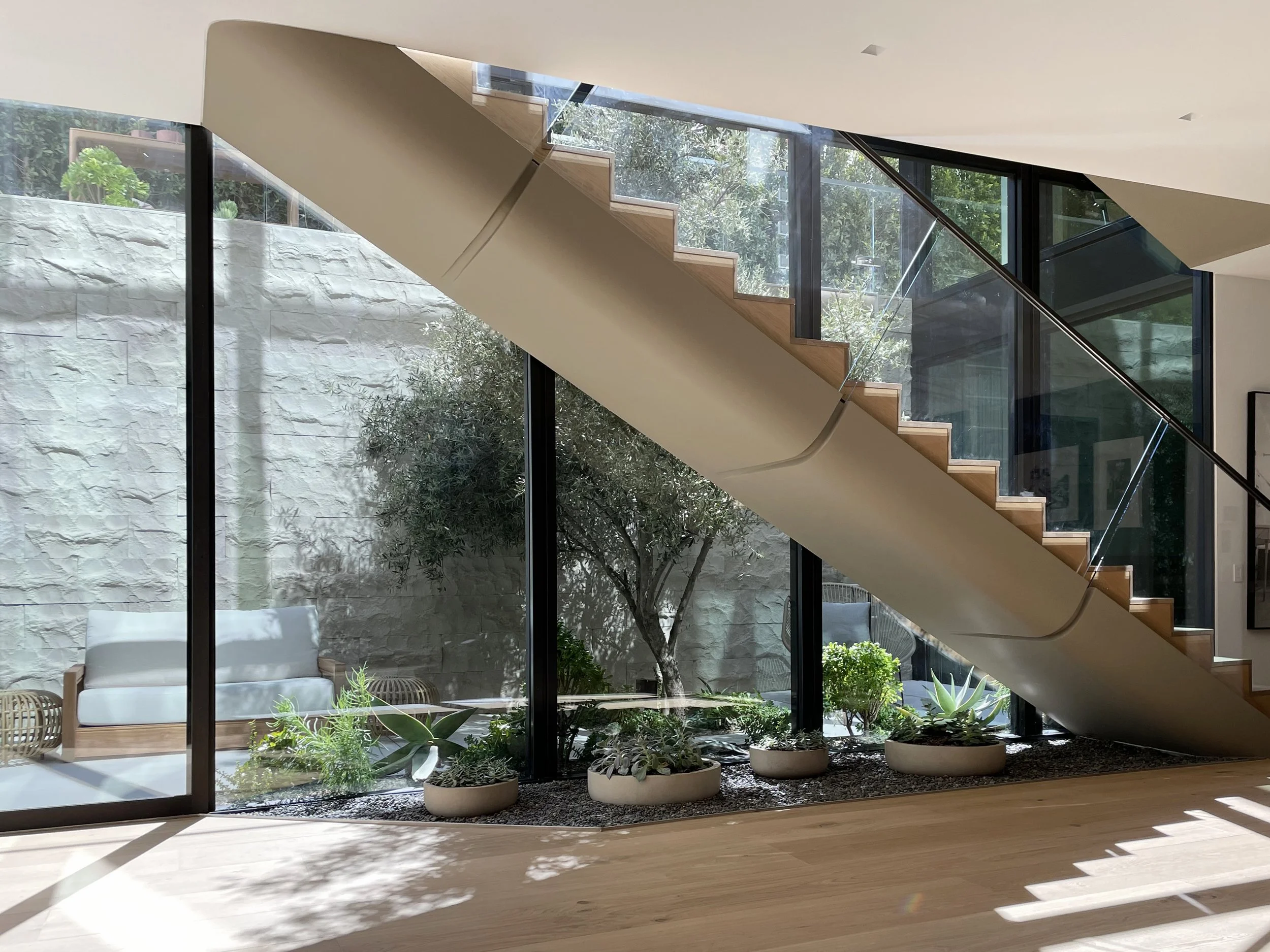 Winner of the Honor Award for Single Family Residences at the 2023 AIA Los Angeles Design Awards, this stunning house features long span floor plates arranged around a three-story atrium on the building’s south side. Framing was carefully integrated with the façade mullions to eliminate interior posts.