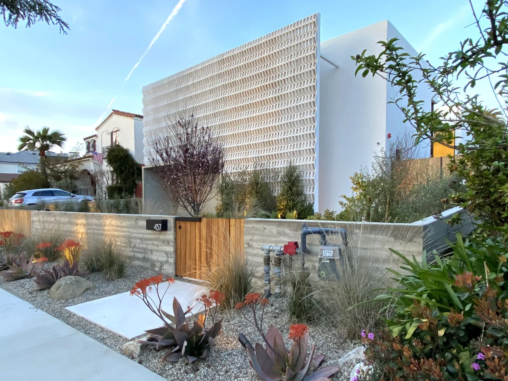 The front of the building is clad with a self-supporting screen wall tied back to the house at limited locations. The composite blocks rely on laser cut steel plates sandwiched between the courses to ensure accurate placement and to hold the blocks in place under wind or seismic loading.