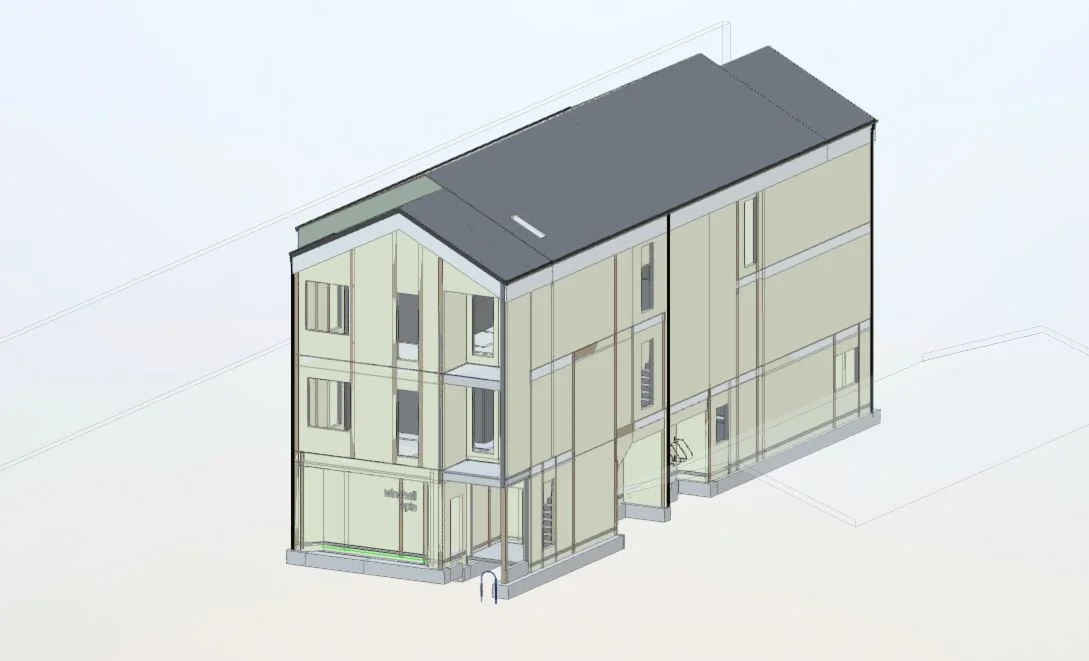 The second- and third-floor cantilever on one side. WPe worked with the architect to configure the floor framing and optimize the shear wall arrangements, whilst allowing for a shifting program that maintains the desired apartment layouts.